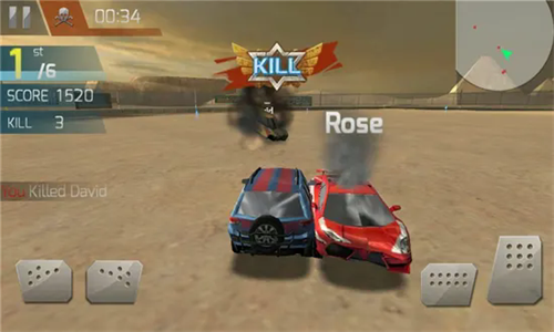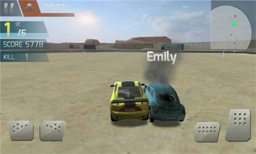 4、在正式比赛环节,点击左下方可以让车辆转向,点击右下方按键可以后退或加速前进,观察小地图我们可以轻易追踪敌方,将它们全部撞个粉碎吧。
