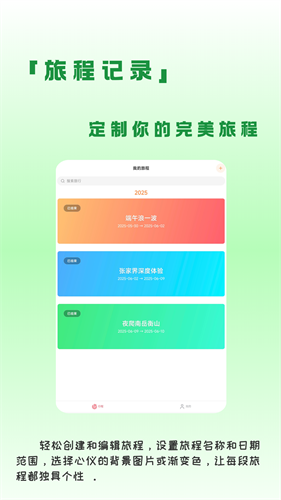 轻松创建和编辑旅程,设置行程名称和日期范围,选择心仪的背景图片或渐变色,让每段旅程都独具个性 。