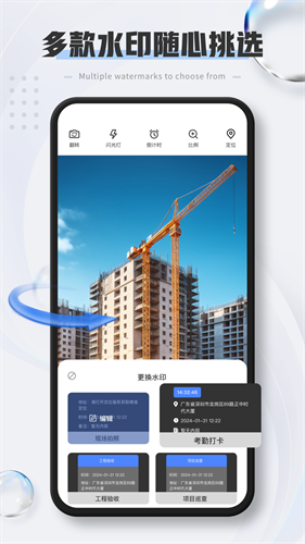 支持添加多种水印模板,会议记录、现场拍照、考勤打卡、日常巡检、经纬度水印、施工记录、地点、时间、美食、天气的水印统统都有。