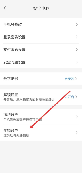 3、在安全中心页面,点击注销账户的选项,后续按照系统提示完成身份验证后即可注销账号。