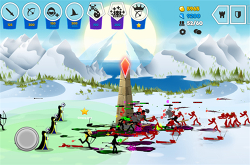 战场实战指挥:玩家置身于紧张激烈的战场上,直接指挥一支由火柴人士兵组成的多元化战队。游戏中提供了多种类型的火柴人士兵供玩家训练,每种士兵都有其独特的技能和用途,如基本的步兵、远程攻击的弓箭手、魔法攻击的法师以及极具破坏力的巨人等。玩家需灵活调度这些兵力,通过精准操作来应对各种战况,有效打击敌人。
