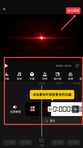 2、进入剪辑界面下方有丰富功能栏,像剪辑、音频、字幕等,编辑好后点右上角保存视频,先把当前进度存好,方便后续继续完善或直接导出。