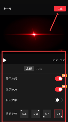 3、若想加水印、片头,在对应设置页可选择使用水印、展示logo等,还能设置水印文案和位置,选好后点生成给视频加上个性化标识,适合打造专属风格内容。