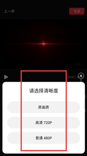 4、最后一步生成视频前选清晰度,有原画质、高清720P、普通480P可选,根据需求如要画质好选原画质,想文件小选普通,选好后就能生成最终视频,完成整个剪辑流程。