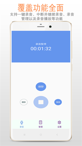 支持一键录音、中断并继续录音、录音管理以及录音播放等功能
