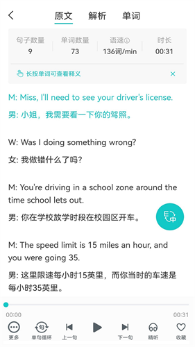 3、精听泛听双模式:支持逐句循环精听、整篇泛听,搭配原文翻译与重点词汇解析,攻克连读弱读等听力难点。