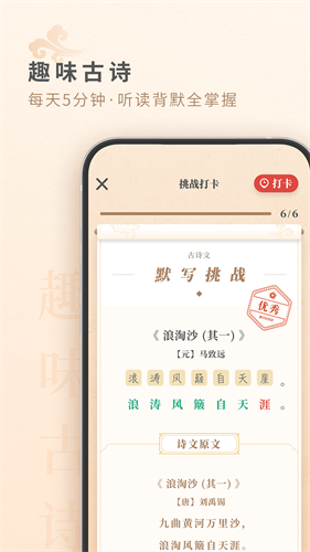 每日5分钟趣味挑战涵盖1-9年级教材古诗,通过朗读、背诵、默写三维度巩固传统文化积累。