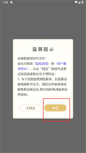 1、首先打开app,进入后点击【同意】隐私政策和服务协议。