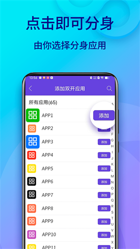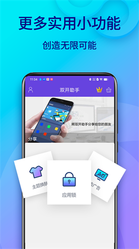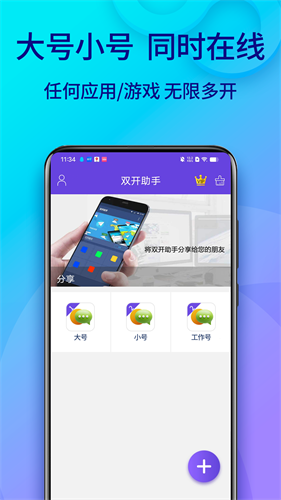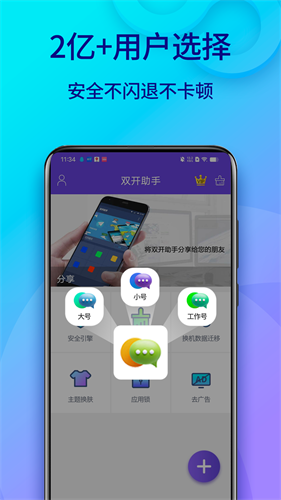 双开助手的应用多开分身功能,更稳定的微信多开宝,完美支持微信、派派抖音、游戏等所有应用无限多开分身,依托独立内存管理机制,手机无限多开不卡顿。