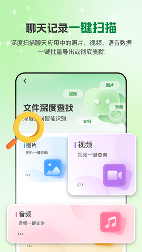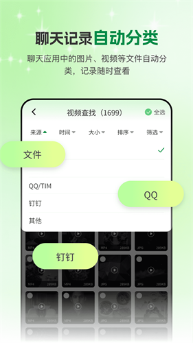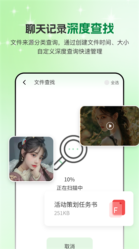 深度的扫描功能,可自动扫描手机和社交平台文件,便于查看。