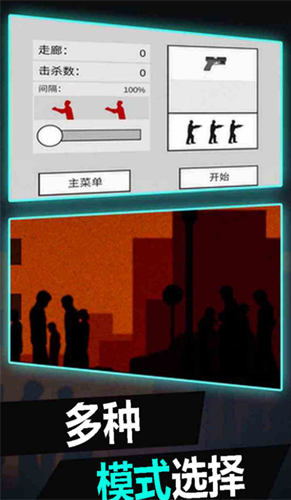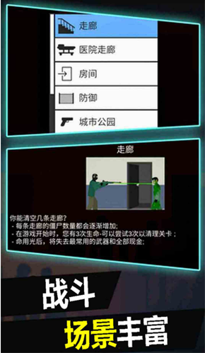 《平面僵尸》一款横版风格的僵尸题材动作射击类游戏,采用了传统的虚拟引擎控制角色的移动和射击,在游戏中玩家和僵尸大军进行激烈的对抗,游戏中有各种的武器装备任意选择,从而依靠这些武器存活下去。为方便玩家更好地了解模式,旁边都会写好游戏说明,比如说事务所模式,在黑暗地办公室走廊,当你前进地时候僵尸就会攻击你,并且你只有一条命,可以给予玩家很好的游戏体验。