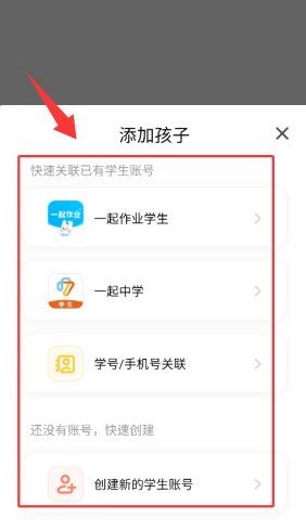 3、可选择快速关联已有学生账号,或点击创建新账号进行添加。