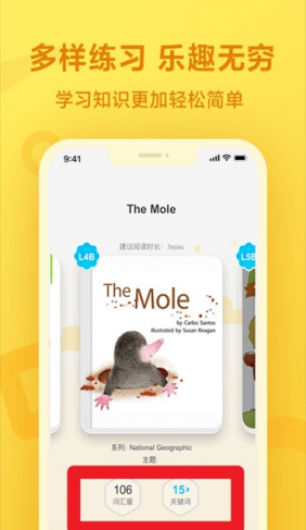 3、每篇阅读材料下方会标注词汇量和推荐时长,方便孩子有计划地练习。