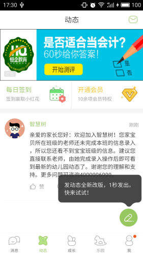 2、点击【动态】界面右下角的“编辑”图标,即可编辑动态并同步至成长日记;
