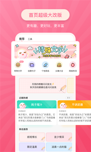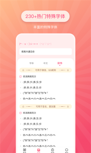 特殊文字app下载免费版是一款创意文字工具应用,它汇集了上百种风格迥异的字体样式,从优雅手写体、酷炫金属字到梦幻泡泡文,再到呆萌颜文字与emoji组合,应有尽有,用户只需在应用内选中心仪的文字样式,一键复制即可无缝粘贴至微信、微博、小红书、抖音等主流社交平台,无需复杂设置或额外授权。这款应用通过智能编码技术,将装饰性字体与符号组合转化为通用Unicode字符,实现跨平台兼容使用,无论是想为游戏ID添加闪耀边框,为朋友圈文案配上可爱小动物颜文,还是用特殊符号设计独特分隔线,都能在这里快速找到灵感。特殊文字app下载免费版这款应用摒弃冗余功能,专注于提供稳定、安全的字体与符号服务,界面整体采用直观的分类导航,查找高效便捷,内置实时预览功能,所见即所得,避免误用。