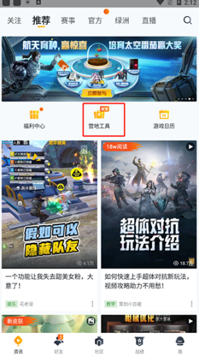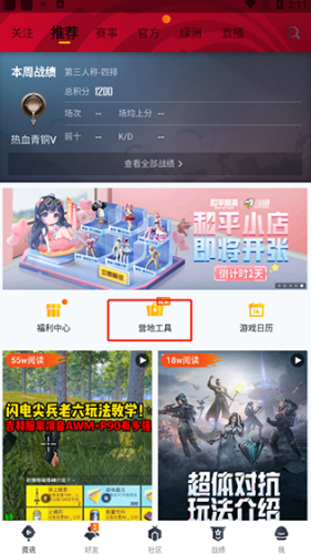 4、打开营地工具页面,即可找到游戏工具(即:对局工具,注意该工具需要当天登录营地,才能激活游戏内的工具功能)。