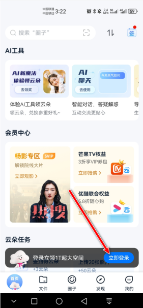 1.首先请在本网站本页面下载安装最新版本的中国移动云盘app,打开软件进入首页,第一种方式是点击立即登录。