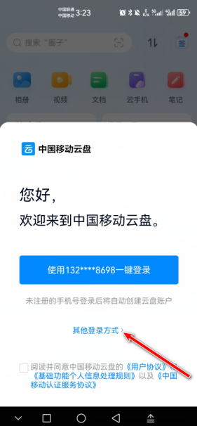 2.点击使用自己的本机号码一键登录,勾选同意和阅读协议。注意的是未注册的手机号登录后将自动创建云盘账户。