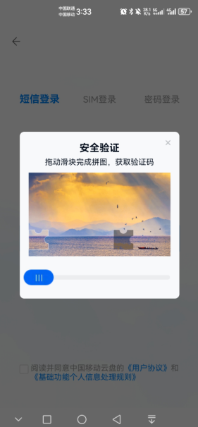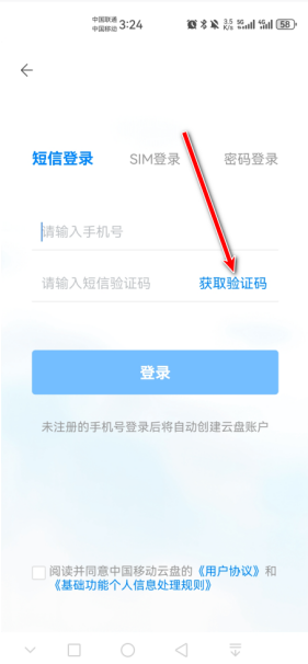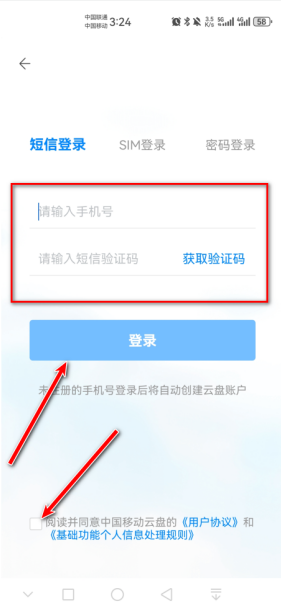 4.选择短信登录、密码登录等等,如果是短信登录,请输入自己的手机号码和短信验证码,再点击勾选同意协议,点击登录即可。此处注意的是未注册的手机号登录后将自动创建云盘账户。