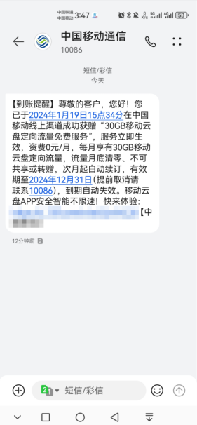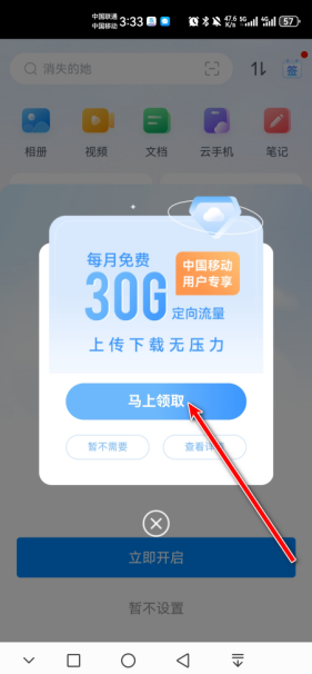 2、移动送流量:移动用户可领取每月30G云盘专属流量。