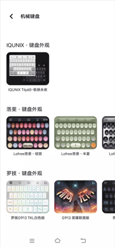 找到【机械键盘】之后,会显示多种样式供您选择,有IQUNIX、有洛斐、有罗技等键盘外观,其中洛斐和罗技有多款键盘外观供大家选择,大家可以自己使用体验。