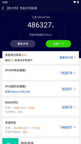 3、可上传分数并查看排名,通过排名查看分数高的机型,也可查看当前手机的排名位置。