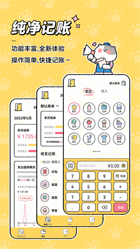 4、智能归类支出数据,生成"猫咪语"解读报告,如"喵呜~本月娱乐费超标啦"。