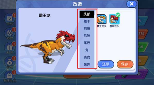 1、改造可以让之前进化的恐龙部位还原到之前的样子,包含头部、躯干、前后肢、尾巴等。
