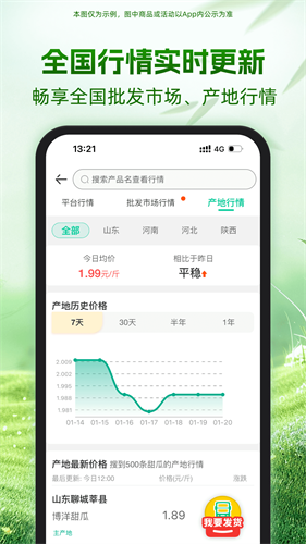 基于平台真实的交易价格及丰富的行情信息来源,大量采集来自供应端、采购端、批发市场的实时价格数据,并结合复杂的大数据智能算法,帮助农业从业者及时掌握全国农产品产销行情和农业商机。目前,行情囊括水果蔬菜、农资种苗、水产海鲜、农副产品等多个类目,每日实时更新,更有平台活跃的行情官每日实时播报产销行情。此外,还提供智能搜索、行情短评等功能,为用户进行农产品供需分析和预测提供数据指南,成为农业从业者重要的生意参谋。