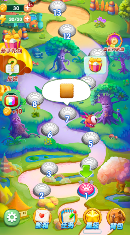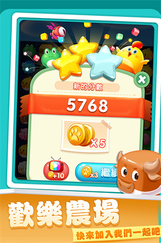 消除方块采用的是动物一头身,圆圆滚滚的可爱形象,这就比很多三消在这方面的设计上要出彩不少。而且消除机制还多加了一层饼干的叠加状态,和其他机制搭配起来让可玩性更进了一步。要是下方的广告能去掉就更赞了。