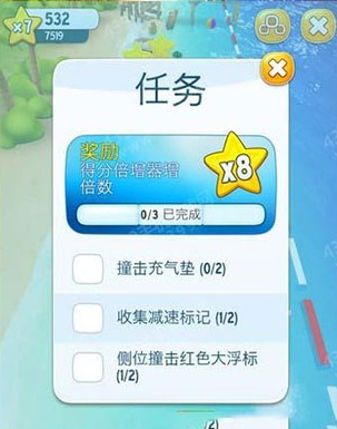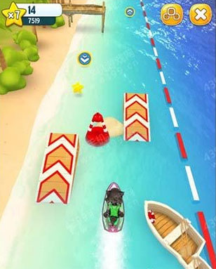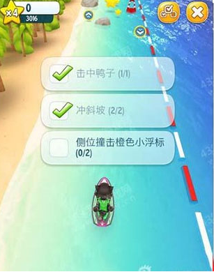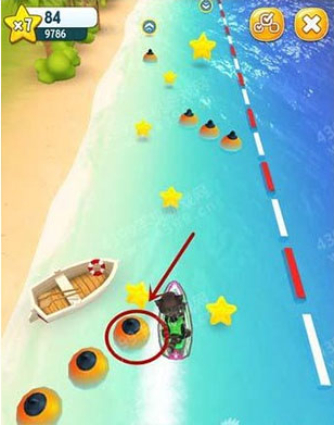 游戏挑战的主要任务就是在飙艇的过程中躲避各种障碍物,获取加速道具,收集散落海滩的金币。