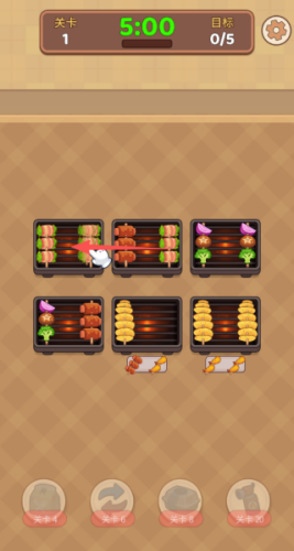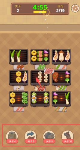 1、主要的玩法就是将关卡中的烤串,全部都消除完成关卡的任务。