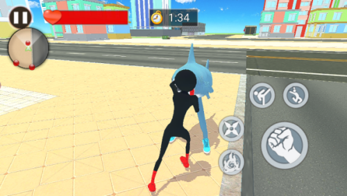 3、虚杆控制火柴人向前移动,按照地图红色标记出寻找隐藏在城市里的罪恶怪兽并击败。