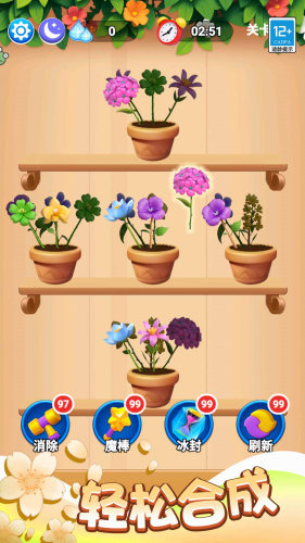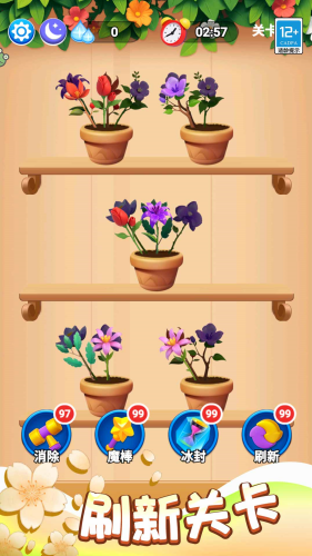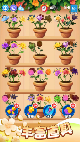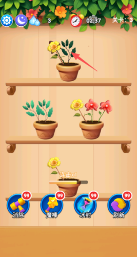 2、游戏规则很简单,把3朵一样的花挪到同一个花盆里,就能消除,还有花瓣动画和好听的音效,玩着很爽快。