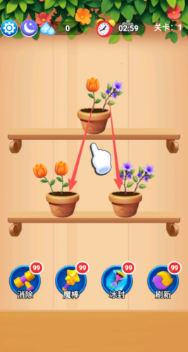 1、将相同类型的植物拖拽合并,将关卡场景中所有的花朵全部消除完成任务。