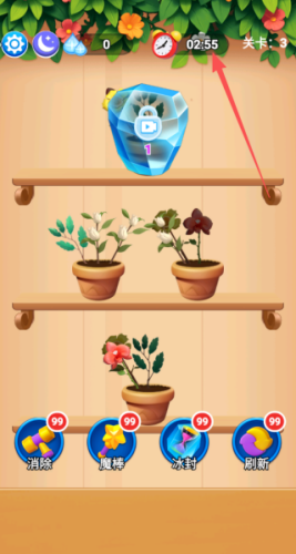 3、关卡越往后,花盆布局越复杂,还会遇到被叶子挡着的花、要多消几次的硬花盆得好好规划怎么挪才能过关。