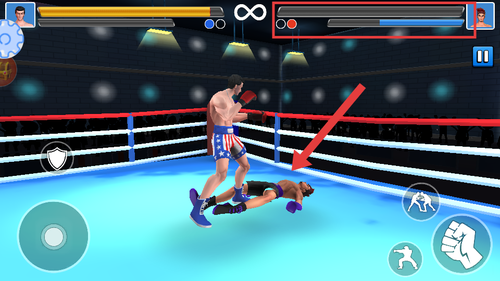 4、观察屏幕上方的血条,持续攻击对手,当对手血条清空倒地,即可赢得本场拳击比赛胜利。