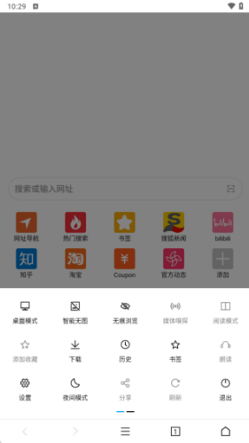 3、点击首页底部中间的三条杠,用户可以查看并使用更多浏览器功能。