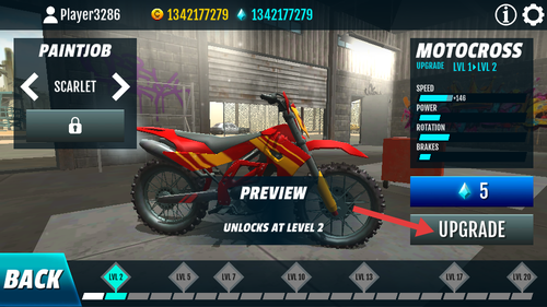 1、升级摩托车,提升速度、力量等属性,增强摩托车性能,更好应对赛道挑战。