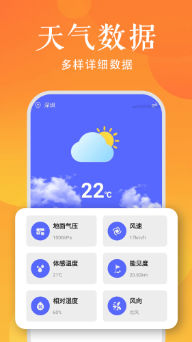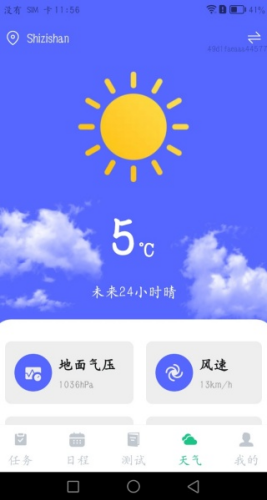 3、切换到天气板块,这里会显示出实时的天气,还有地面气压和风速。