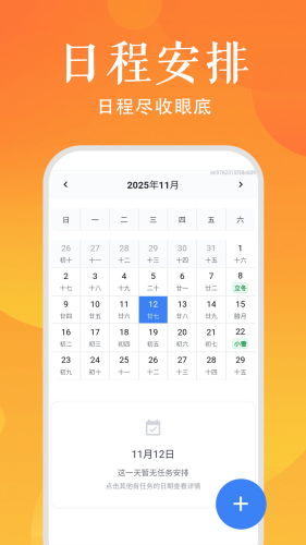 时光日程规划官方版app是一款非常实用的日程时间管理工具,为你的日程管理提供便利,你可以通过这个平台来添加自己的日程计划,根据具体的事项需要来选择对应的日期就可以了,平台可以根据你的安排来实时的提醒,这样就不用担心自己会错过了,还可以及时的带来天气预报信息。一站式搞定全场景时间管理,一键添加待办后,系统自动识别任务属性分类,无需手动归类,优先级按规则清晰标注,让核心事务快速凸显,有需要的用户欢迎前来下载试试哦。