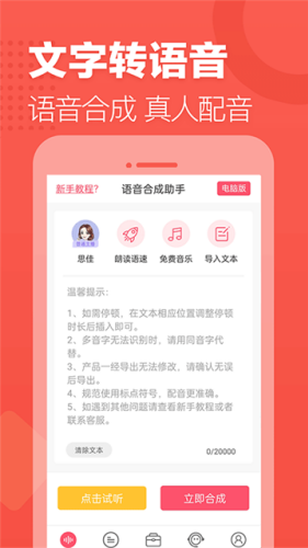4、简便易用:语音合成助手的操作界面简洁明了,用户可以轻松上手并快速实现文字转语音功能,还是需要长时间听取大量文字内容的人群来说,享受到优质的语音合成服务。