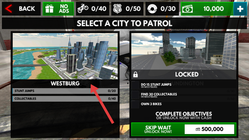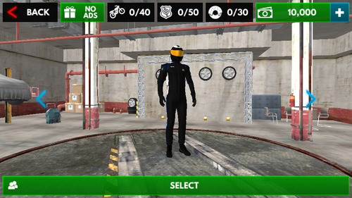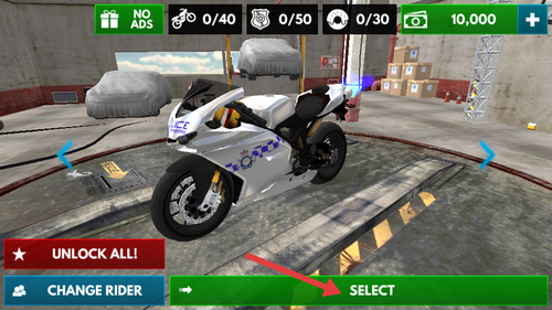 1、在车辆选择界面点击绿色SELECT按钮,确认所选摩托车后即可开启城市巡逻任务。