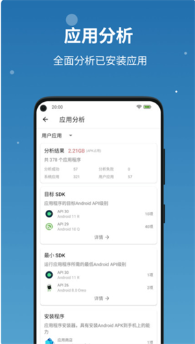 轻松管理本地应用、用户应用和系统应用。还可以查看应用程序的详细信息,Activity、权限、签名和Manifest文件等。