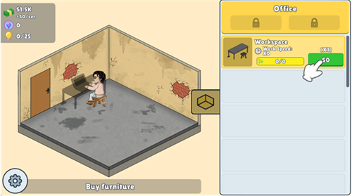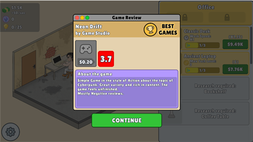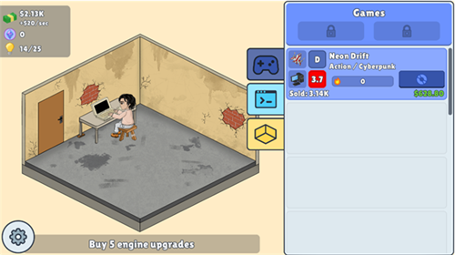放置游戏开发模拟器破解版是一款卡通风格的放置类模拟经营游戏,讲诉了一个码农在房屋里面开发游戏的故事,开局玩家会有一个破旧的小屋和基础设备,然后自主设计游戏并给游戏命名,升级后可以解锁更多的物品,它们都有着不同的加成,确定方案后点击开发按钮,等待一段时间即可完成制作并发布,之后就能够查看售卖数量和收益。在赚取到了资金后就能够升级自己的电脑配置、优化开发引擎来提高制作游戏的效率,还可以招募其他的优秀人才来一起创作,不断发展自己的公司。