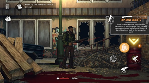 4、当遇到僵尸怪物后可以点击射击按钮来进行攻击,使用黄色按钮可以投出手榴弹攻击敌人。