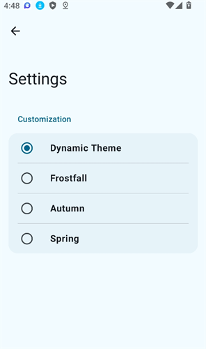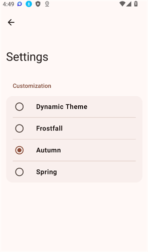 主题风格可切换:在设置的“Customization”选项中,提供Frostfall、Autumn、Spring三种动态主题,用户可根据喜好调整,兼顾功能性与美观度。