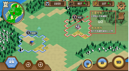 2、进入关卡后紧盯【主要任务】-【占领敌人所有建筑】,同时防范【失败条件】-【我方建筑被占领】,优先守护核心建筑。