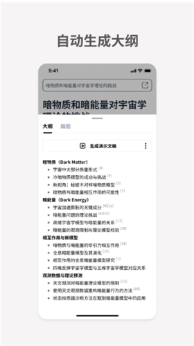 2、自动生成大纲,脑图,相关事件/组织/人物表格。