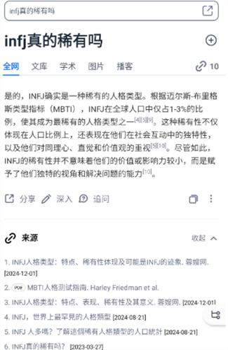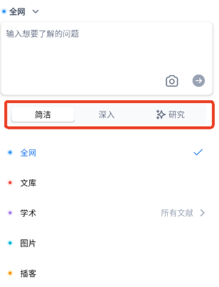 1、输入想要了解的问题,可以选择三种搜索模式,分别是简洁、深入和研究,还可以选择搜索范围,全网、文库、学术、图片和博客。